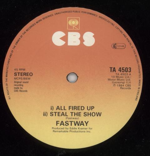 FASTWAY All Fired Up (1984 UK 3-track 12" single, from the band featuring Eddie Clarke of Motorhead, also including Steal The Show and Hurtin' Me. The flipback style picture sleeve displays minimal wear and the vinyl looks barely played TA4503)