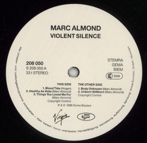 MARC ALMOND Violent Silence (1986 German-only 5-track 12" vinyl EP, featuring Blood Tide, Healthy As Hate, Things You Loved Me For, Body Unknown & Unborn Stillborn - songs written for a celebration of the work of the French writer Georges Bataille in 1984, picture sleeve)