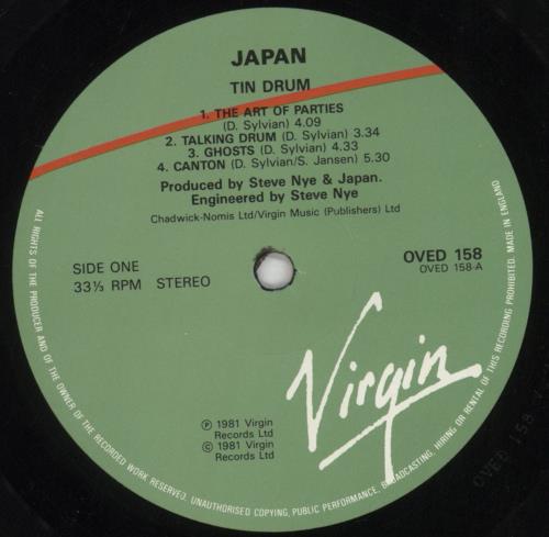 JAPAN Tin Drum (1984 UK issue of the 1981 8-track LP on the red/green label, including The Art Of Parties, Ghosts & Visions Of China, glossy picture sleeve. The sleeve shows some minor edgewear with a seam split to the bottom edge and the vinyl has just the odd cosmetic scuff OVED158)