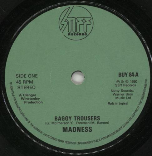 MADNESS Baggy Trousers (1980 UK solid centre 7" vinyl single, also including The Business, issued in a Stiff company die cut paper sleeve. The label displays a pen annotation whilst vinyl remains in excellent condition BUY84)