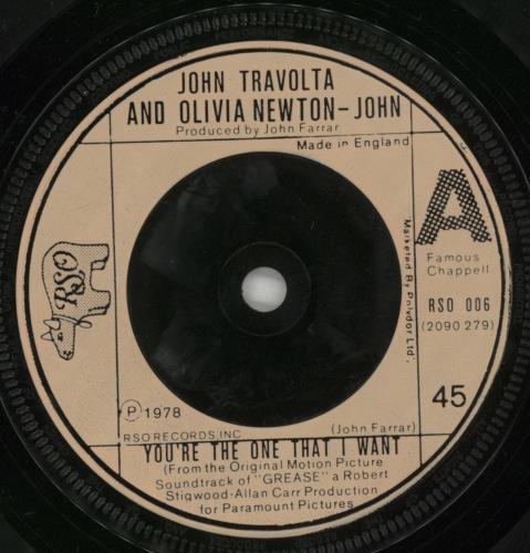 OLIVIA NEWTON JOHN You're The One That I Want (1978 UK injection moulded label 7" single, also including Alone At A Drive-In Movie, paper picture sleeve. The sleeve shows very little wear and, aside from a few very light paper scuffs, the vinyl is in excellent condition RSO006)