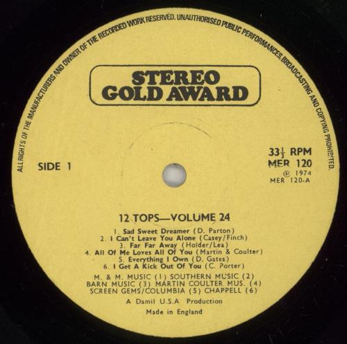 VARIOUS 12 Tops - Volume 24 (1974 UK 12-track vinyl LP featuring re-recordings of classic hits from the time, including versions of Sad Sweet Dreamer, All Of Me Loves All Of You, I Get A Kick Out Of You, Long Tall Glasses, You Little Trust Maker and more, picture sleeve. The sleeve shows minimal storagewear and the vinyl looks barely played MER120)