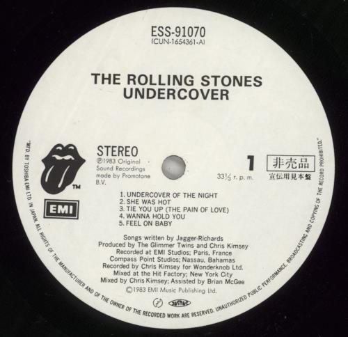 ROLLING STONES Undercover (Rare 1983 Japanese promotional sample 10-track LP with custom black on white labels, housed in a promo stickered picture sleeve with illustrated inner, fold-out Japanese/lyric insert and obi-strip. The sleeve shows minimal wear and the vinyl is Near Mint ESS-91070)