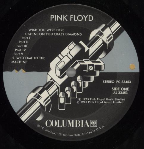 PINK FLOYD Wish You Were Here (Scarce Late 70s, early 80s US issue of the 1975 5-track LP with black & green 'mechanical handshake' labels, barcoded picture sleeve & illustrated credits inner. The sleeve ,with no deletion cuts,carries light shelf/edgewear whilst the vinyl appears Near Mint with few signs of play JC33453)#Top 500 Greatest Albums Of All Time