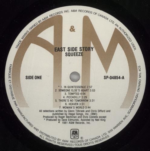 SQUEEZE Eastside Story (1981 Canadian 14-track vinyl LP co-produced by Elvis Costello, housed in a picture sleeve which, along with the vinyl , carries light signs of wear/play SP-04854)