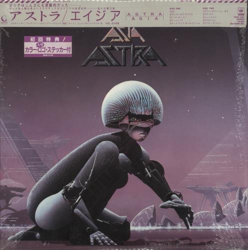 ASIA Astra (1985 Japanese limited edition 10-track vinyl LP, housed in a superb Roger Dean designed sleeve complete with fold-out lyric insert, the original top card obi-strip & a bonus promotional-only sticker set of colour band name logos. This collector's copy is Near Mint & still in the hype stickered open shrinkwrap 28AP3120)