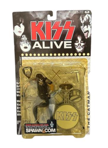 KISS Kiss Alive Figure - Peter Criss (Original 2000 US out-of-production limited edition 7" action figure released by McFarlane Toys as part of their officially licensed KISS: Alive! series. This highly detailed figure depicts drummer Peter Criss in full stage regalia from the band’s iconic Alive! era, complete with signature face paint and drum kit accessories, faithfully capturing the Catman's classic live persona. Still sealed in its original factory bubble-style blister packagingmounted to a backing card featuring artwork and logos from the Alive! album aesthetic. The card shows some light water staining to the reverse and minor edgewear with a gentle bend at the top corner and some card cut away at the right side but remains in solid Excellent condition overall)