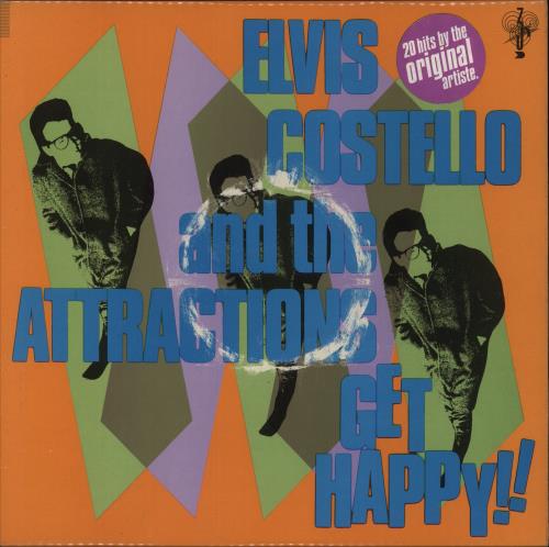 ELVIS COSTELLO Get Happy (1980 UK 20-track LP, housed in a front laminated picture sleeve with purple and white sticker stating '20 Hits by the Original Artiste' on the front. The sleeve shows only minor wear and the inner has some foxing, whilst the vinyl looks barely played XXLP1)