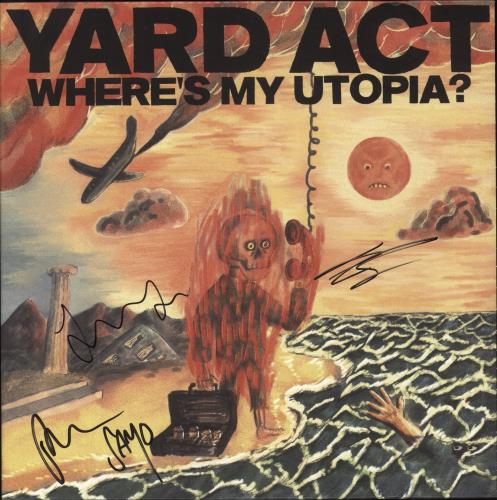YARD ACT Where's My Utopia? (2024 UK/EU limited edition 11-track LP pressed on Vineyard Of The North Red Wine Coloured Vinyl - the Leeds' quartet’s second act is a giant leap forward into broad and playfulnew sonic waters with influences ranging from Fela Kuti to Ennio Moricone via Spiller’s noughties pop smash ‘Groovejet’. Picture sleeve with printed inner and fold-out lyric insert. The front of the sleeve has been Autographed by all four members of the band, clearly in black marker pen. The sleeve and vinyl show just minimal signs of wear and play)